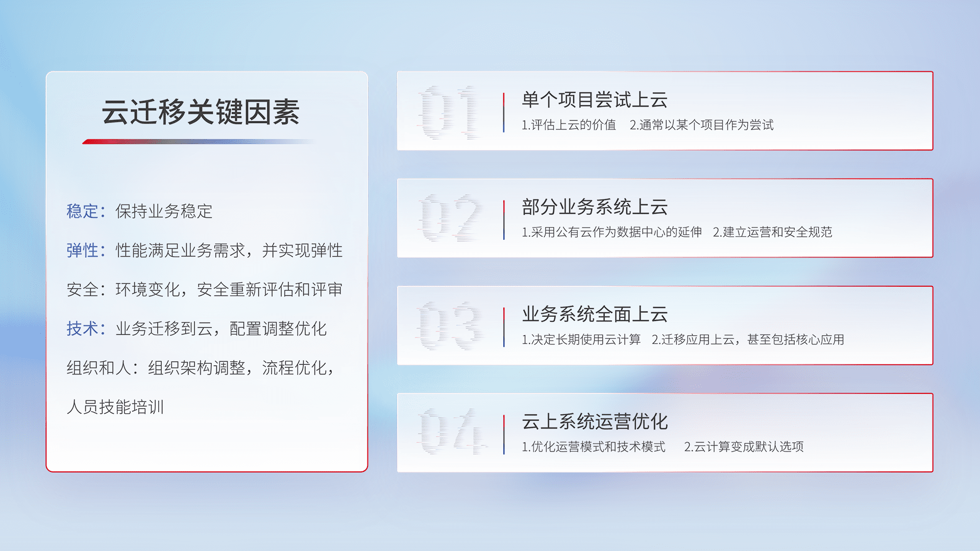 结合实际业务,,,,从规划设计、、、、云平台选型、、、、云原生改造、、数据迁移、、、集成交付,,,,迁移全过程为客户识别最佳上云路径,,,做好风险识别管理,,,设计网络架构、、、身份权限、、、、安全审计合规、、操作审计、、、、日志审计、、、监控告警策略、、多站点容灾设计等,,,,对云上基础设施进行整体规划,,提升IT治理水平,,,,以满足弹性、、高可用、、、、高性能的需求。。。。