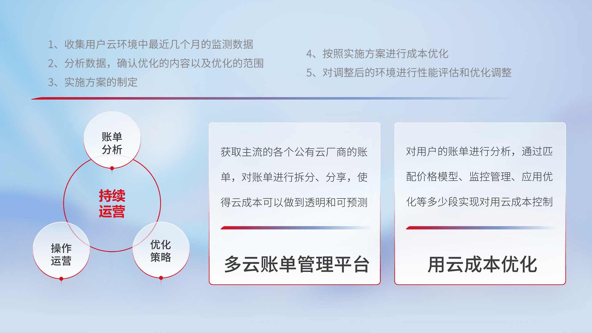 通过多云纳管,,,以统一的资源数据模型把客户的云资源进行抽象和封装,,,进而实现对多云资源的统一操作,,保障云资源管理的可靠性、、、稳定性与可用性。。。。量身定制化运维内容,,配置、、开发运维、、补丁管理、、、备份、、、、监控、、、认证和访问管理、、审计和日常巡检等,,保障在用云过程中的可靠度,,稳定度以及高可用率。。。